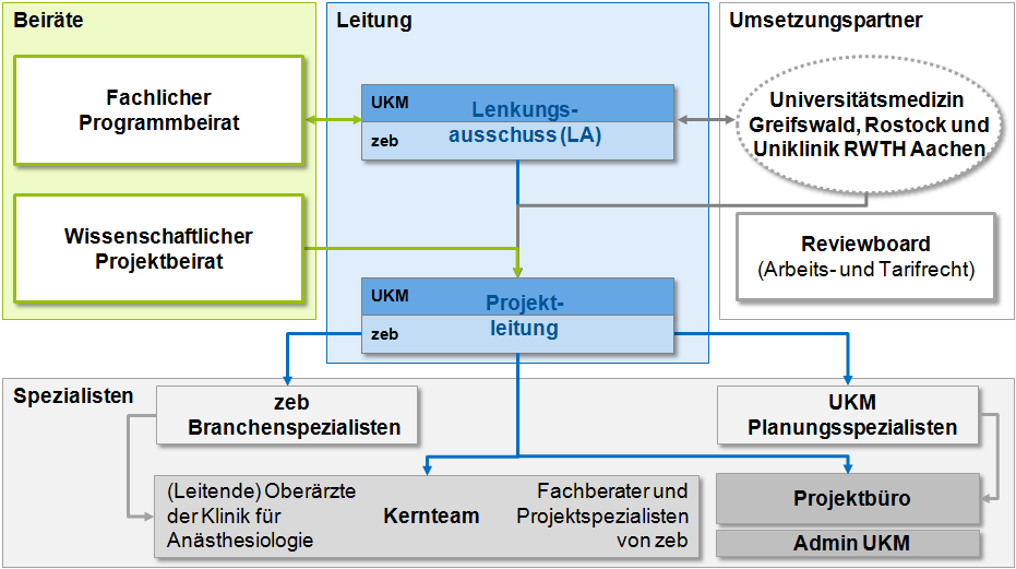 Die Projektorganisation umfasst den Lenkungsausschuss, dem der fachliche Programmbeirat mit seinen Vertretern der Verbände, Sozialpartner und Öffentlichkeit an die Seite gestellt ist, sowie die Projektleitung, die von einem wissenschaftlichen Projektbeirat unterstützt wird. Die Umsetzungspartner werden über Beschlüsse informiert, frühzeitig eingebunden und sind daher stets über den Fortschritt des Projekts informiert, bevor sie im Rahmen von Pilotmaßnahmen eine aktive Rolle im Projekt übernehmen. Die Projektleitung nutzt ein Projektteam, das konkrete planerische, kontrollierende und ausführende Tätigkeiten im Rahmen des Projekts übernimmt: Da damit weit über die Klinik hinausgehende Aspekte des UKM und der universitären Bildung betroffen sind, überwacht und berät ein Team aus UKM-Planungsspezialisten das Projektteam und die Projektleitung. zeb stellt Beratungs- und Projekterfahrung aus verschiedenen Branchen sowie umfassende operative Projektunterstützung bereit, damit das Projekt trotz der vielfältigen Verpflichtungen der Fachärztinnen und -ärzte im UKM und in der Klinik durchführbar ist. Hier finden Sie detaillierte Informationen zu den Projektbeteiligten